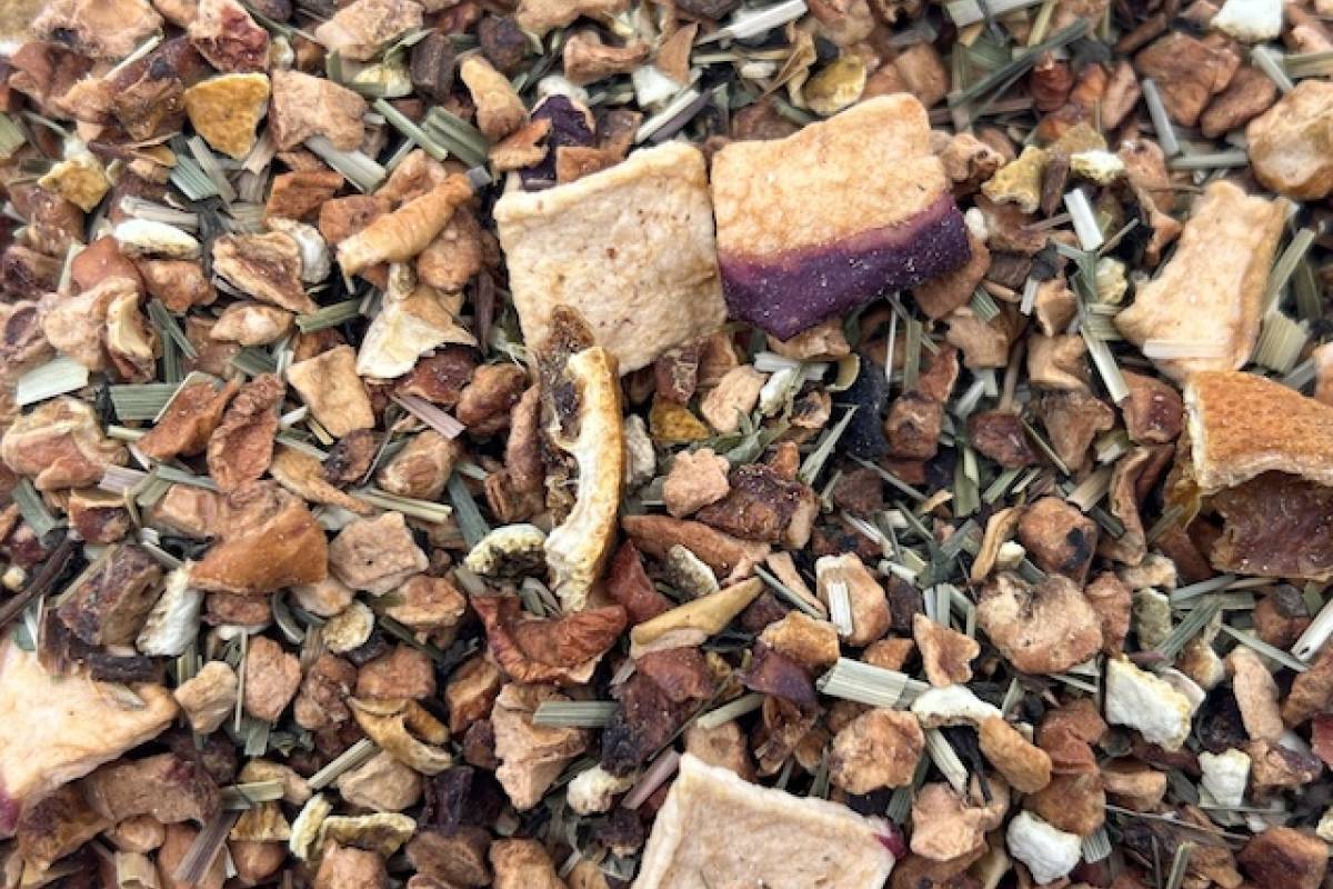 Apple pieces*, citrus peel*, apple slices*, lemongrass*, cinnamon*, citrus slices*, natural citrus flavoring, orange mint*, orange blossoms* (orange petals*, orange buds*), lemon verbena*. *From organic farming